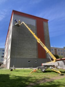 Čištění fasády pomocí vysokozdvižné plošiny.